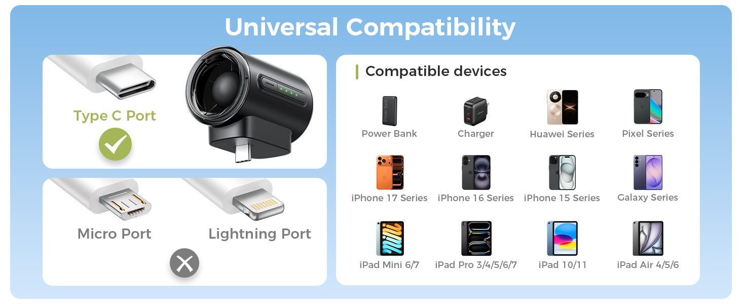এই ফ্যানটি USB-C powered হওয়ায় আলাদা চার্জিংয়ের প্রয়োজন নেই। Just plug and play — perfect for travel, outdoor use, office, or emergency cooling.