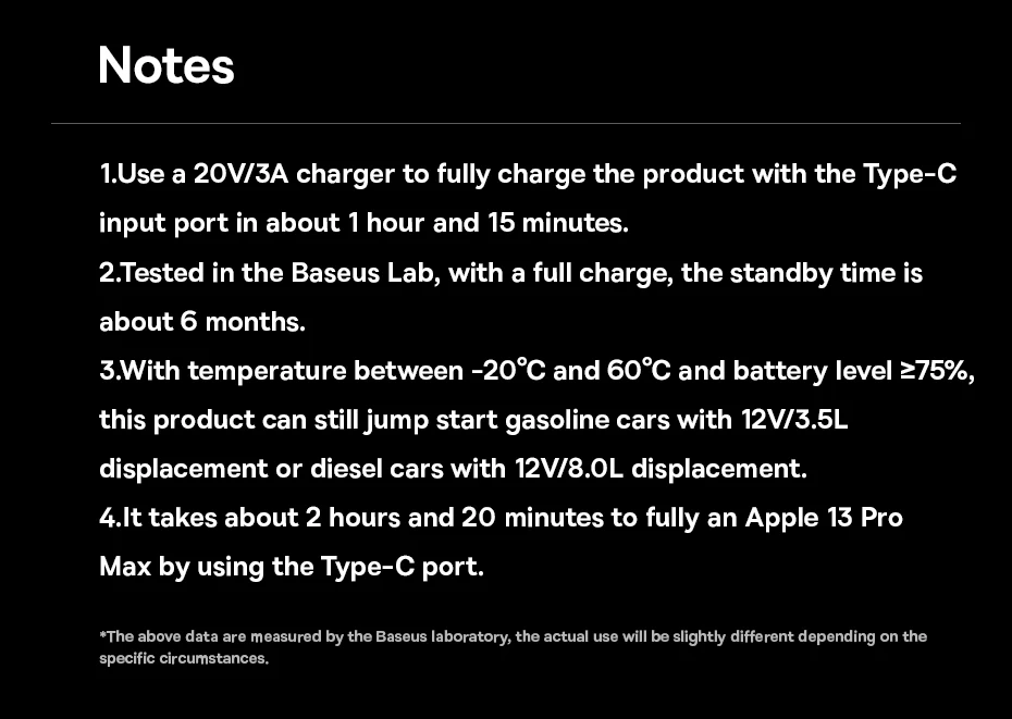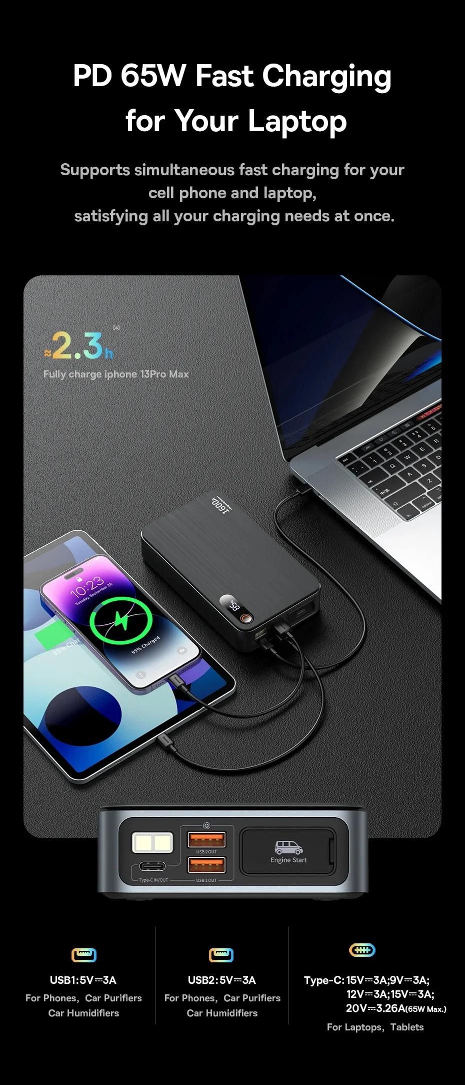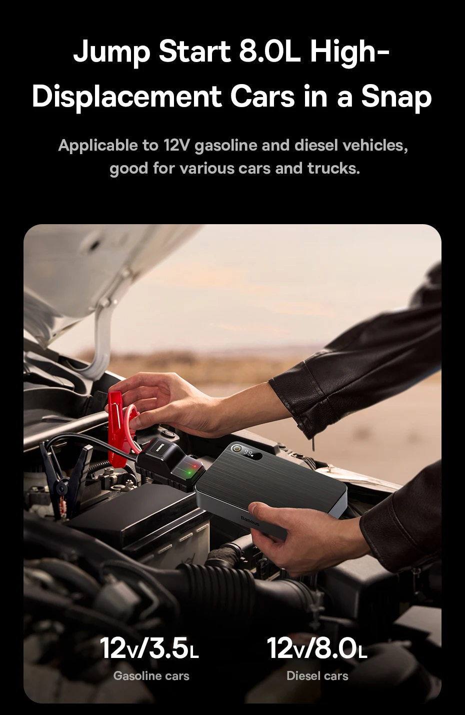 Car jump starter, Starting device, Car booster, Portable power station, Car battery charger. Applicable to 12V diesel cars, including 8.0L diesel cars and 3.5L gasline cars.