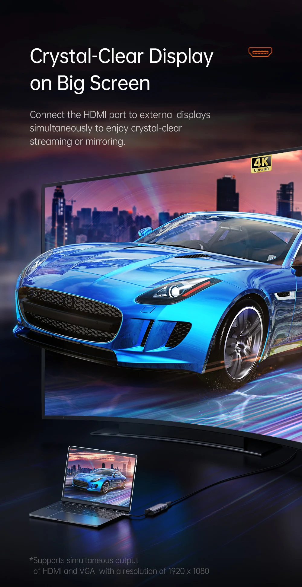 HDMI port provides simple plug-and-play connection to a second display or monitor at resolution up to 3840×2160@30Hz;VGA port provides MAX 1920×1080@60Hz 1080P video output.